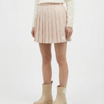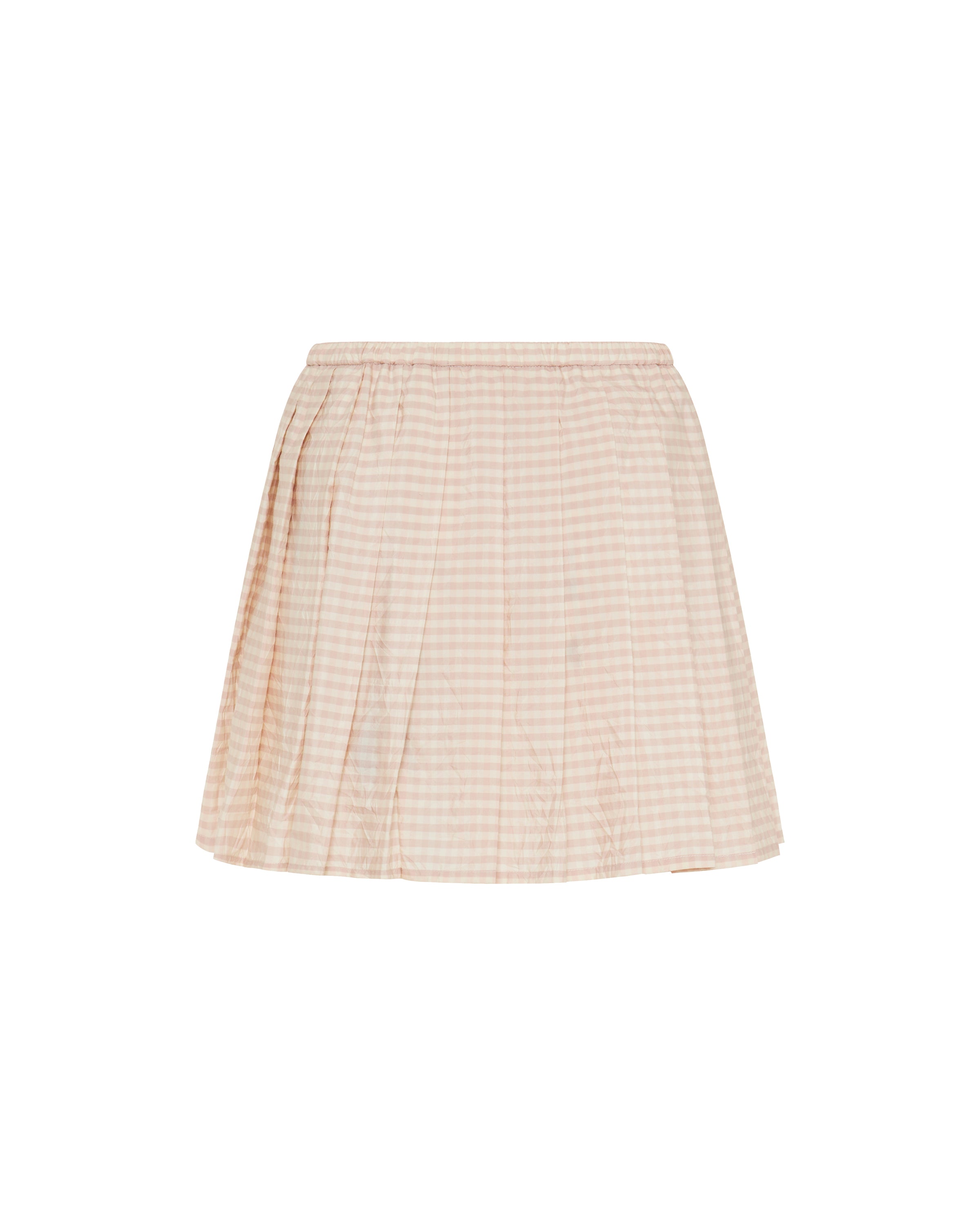 A structured mini skirt defined by crisp pleats and a lightweight cotton-blend construction.