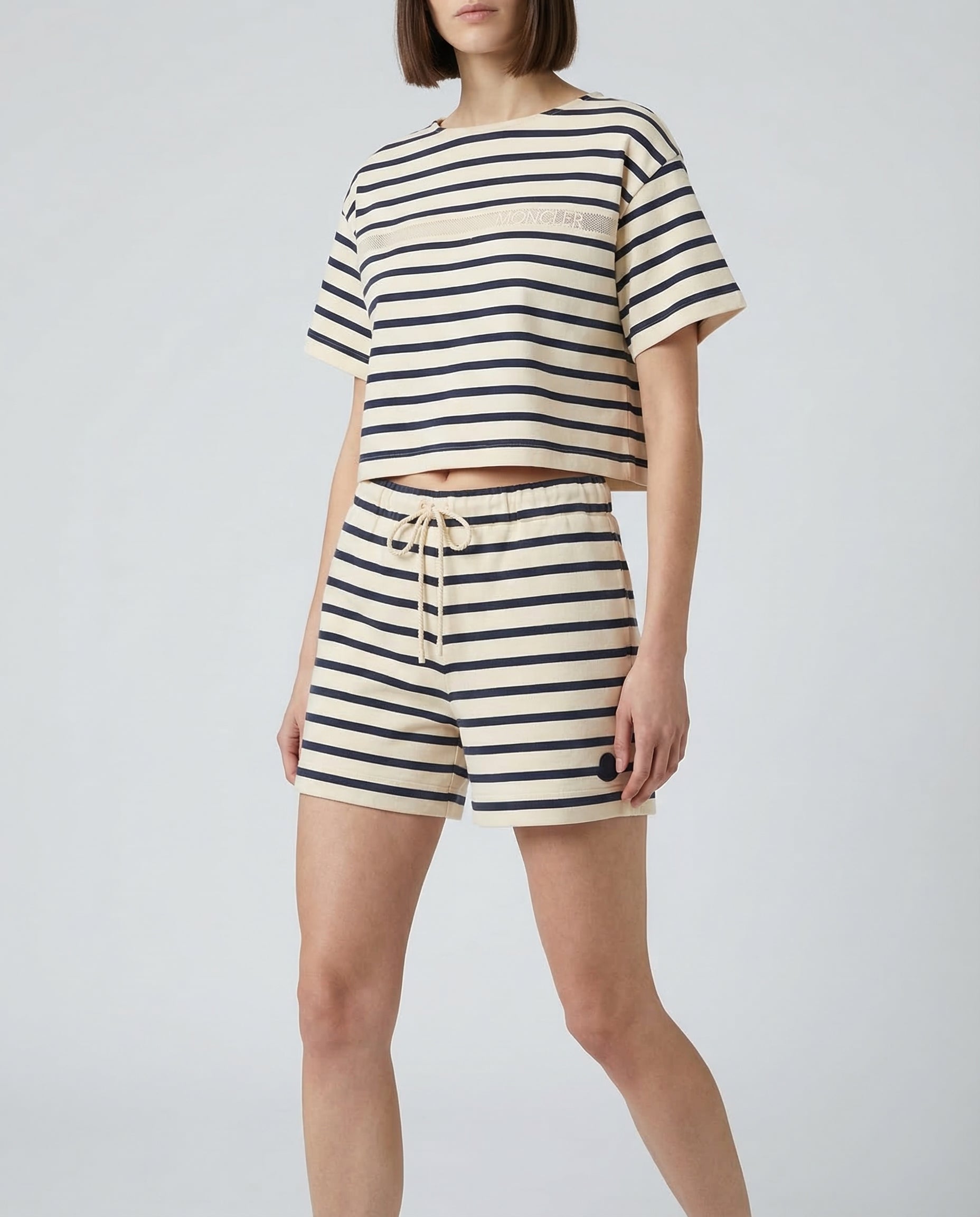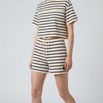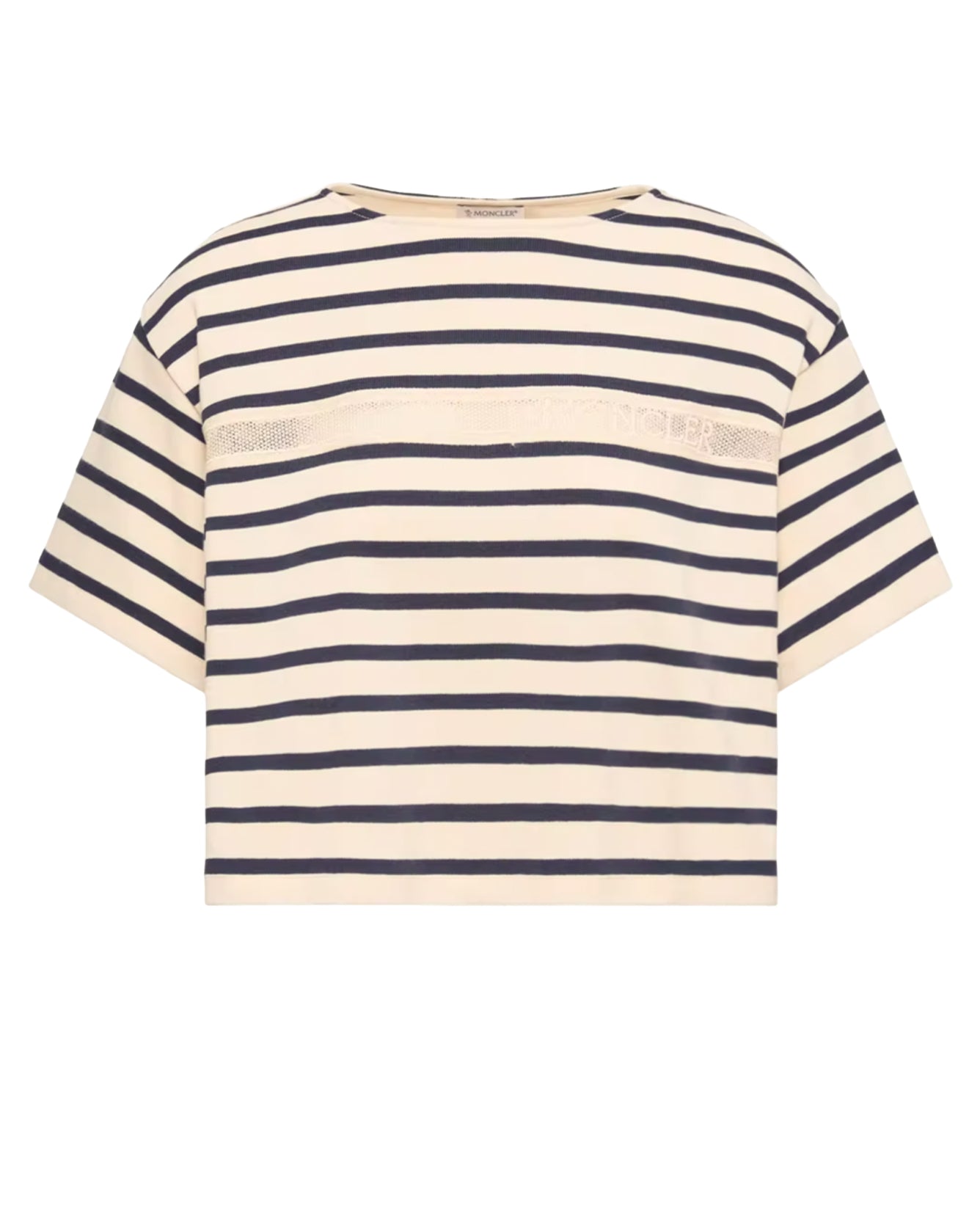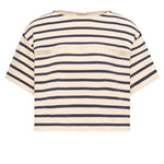 A refined T-shirt crafted from soft cotton, elevated by a classic striped pattern and delicate macramé detailing.