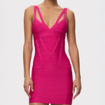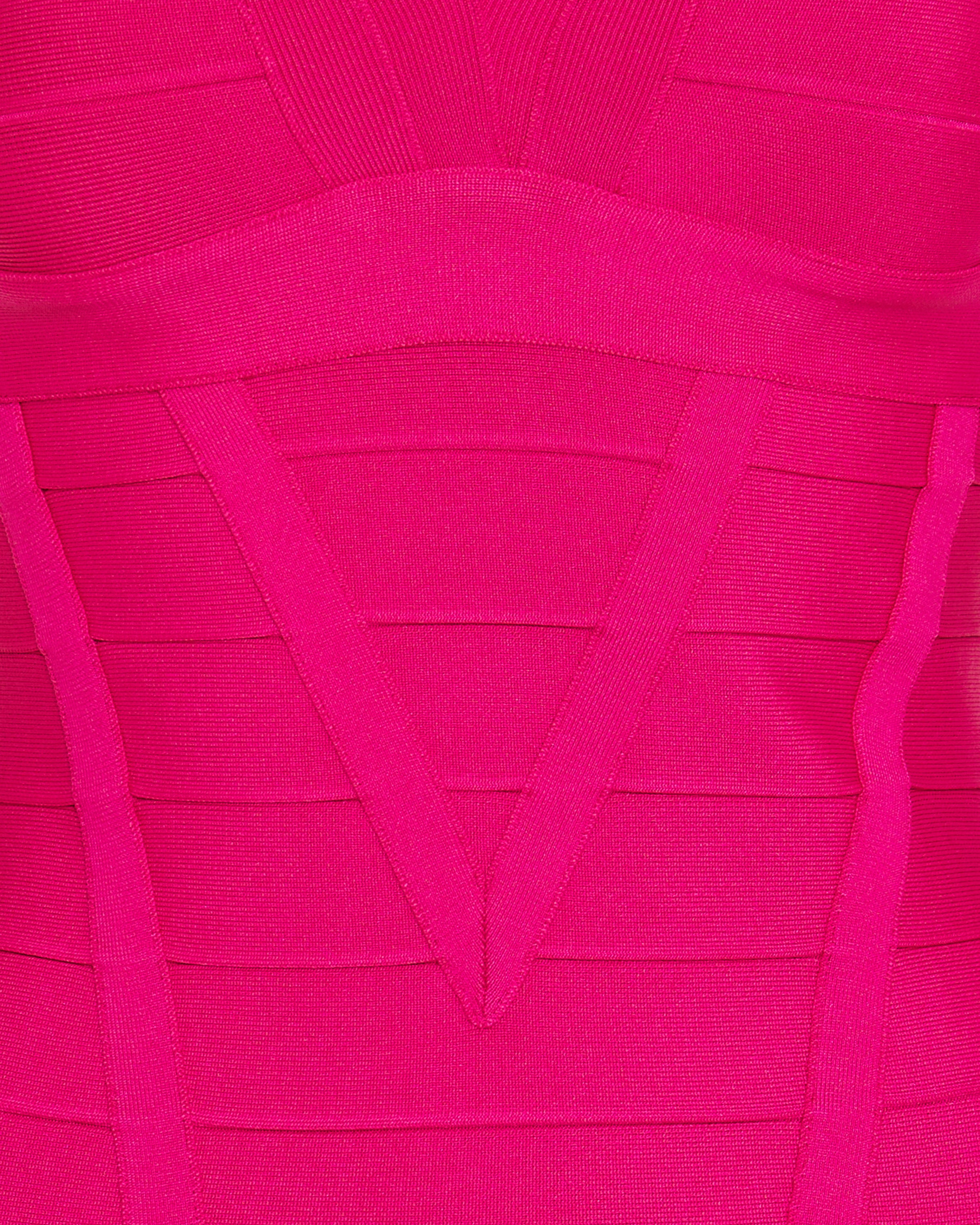 A fitted mini dress in stretch bandage fabric, designed to contour and sculpt the silhouette.