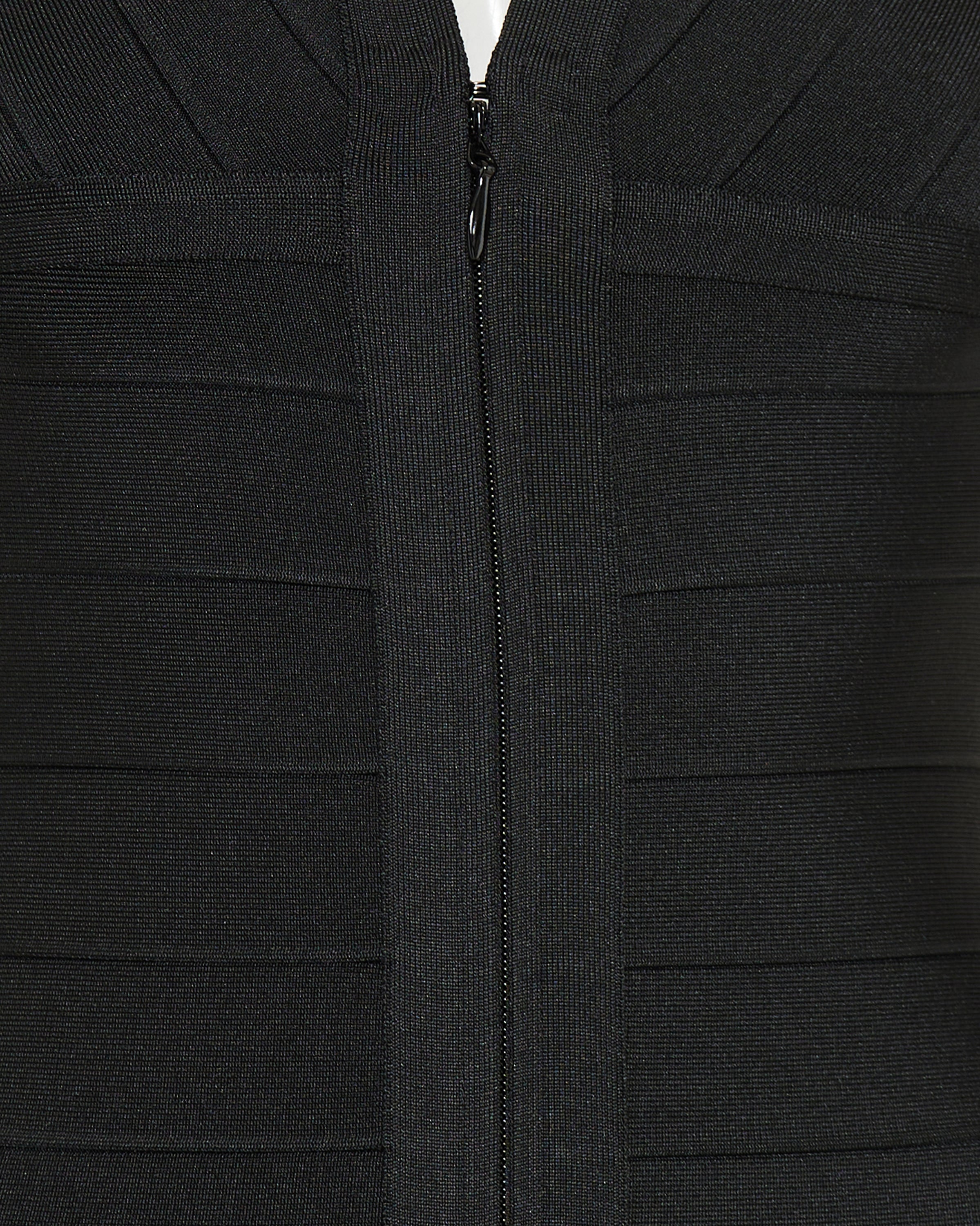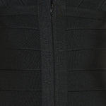 A floor-length gown in stretch bandage fabric, designed for a sculpted, body-conscious silhouette.