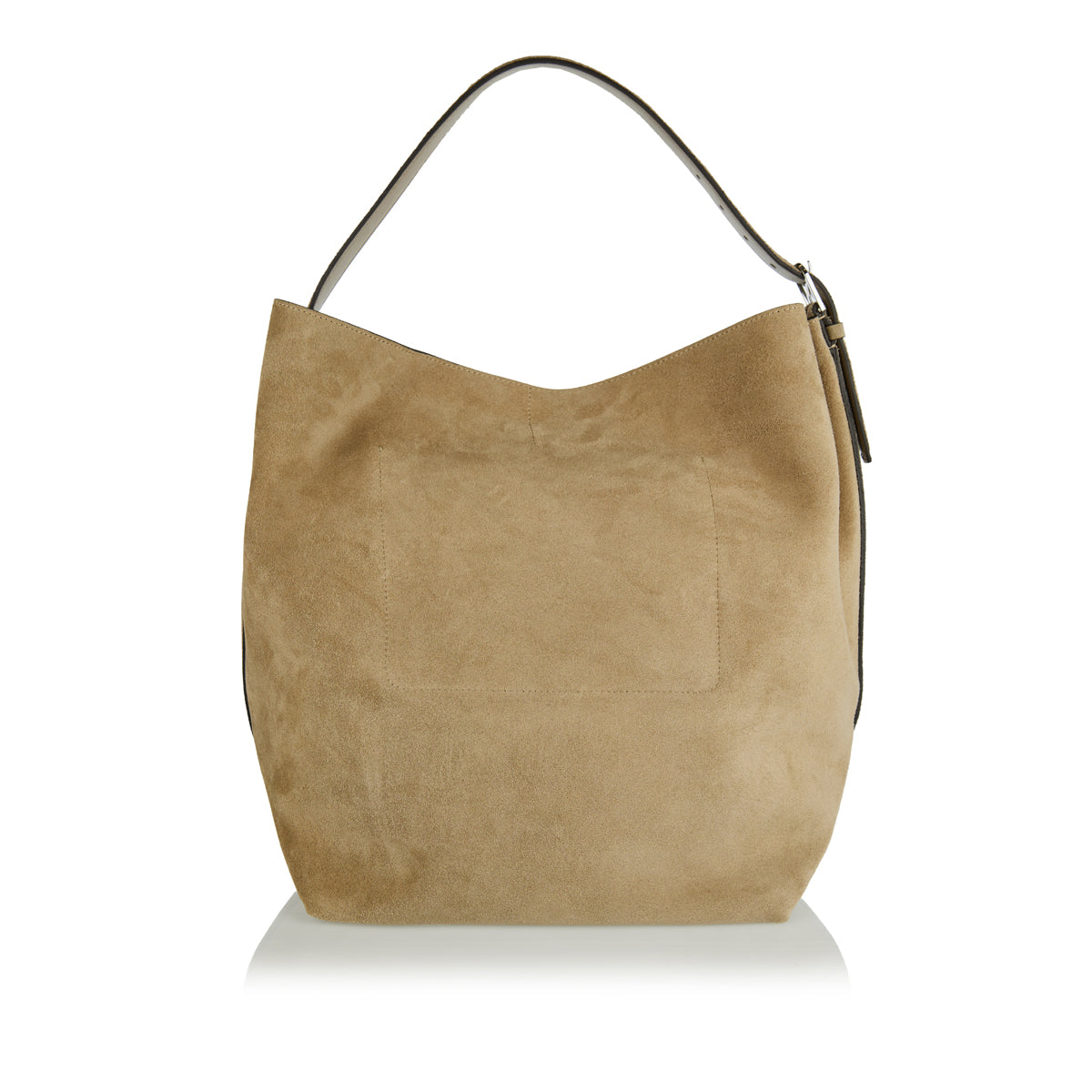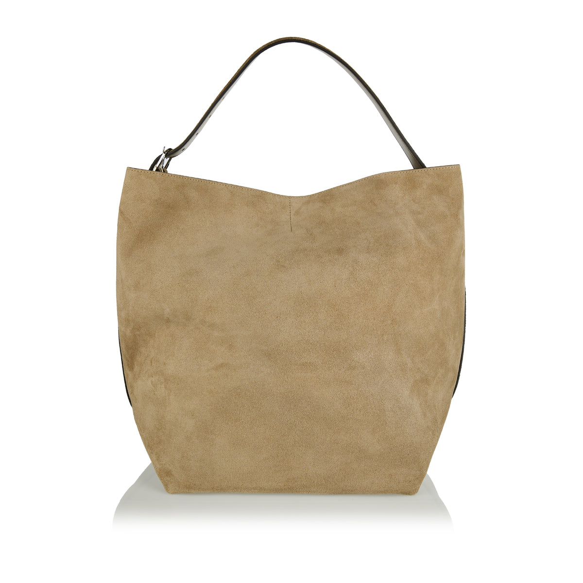 A refined everyday tote bag crafted from desert beige suede, featuring a silver-tone metal buckle and an adjustable strap. The interior is lined with beige resin and includes two slip pockets for organization. Made in Italy, this tote combines elegance with practicality.