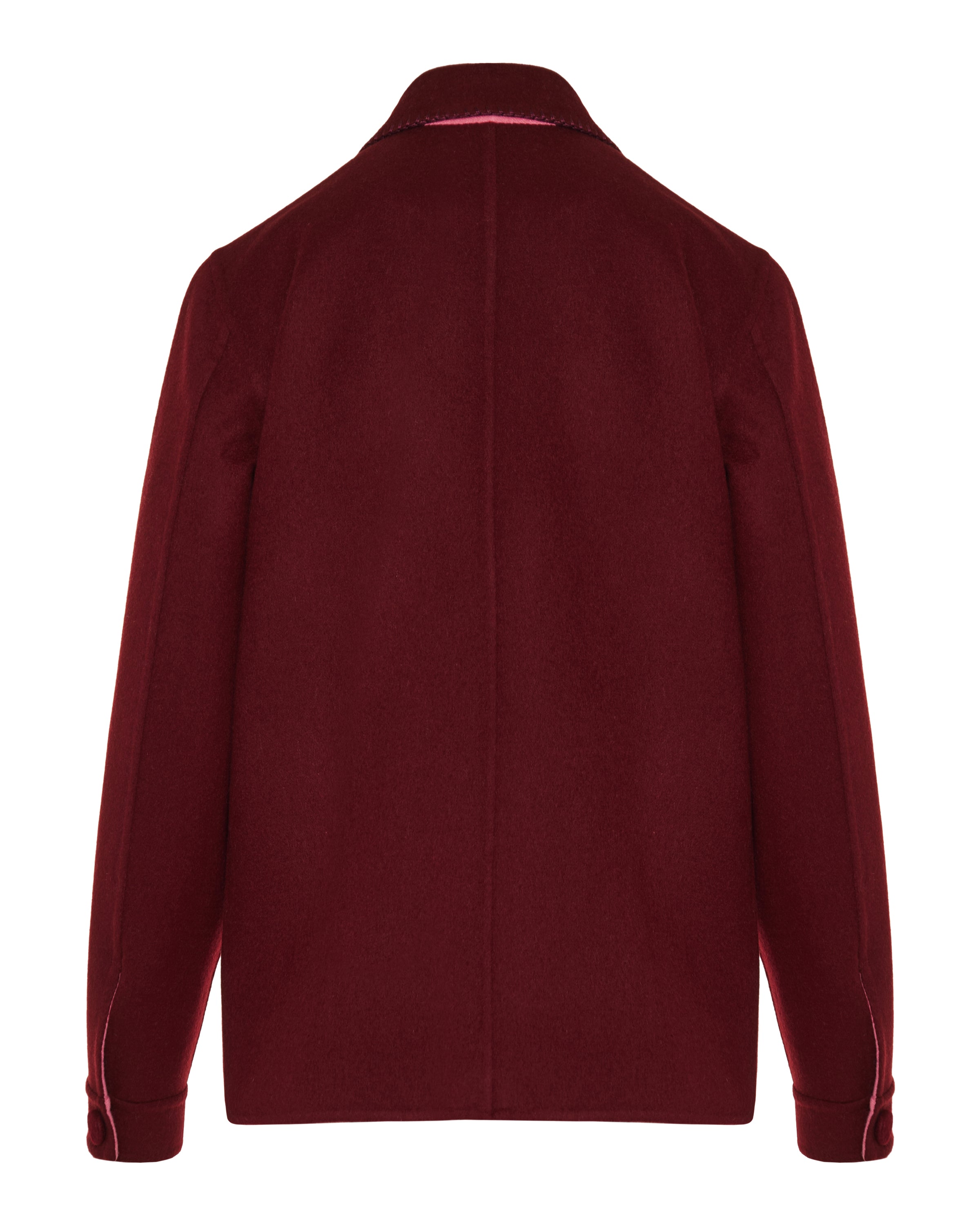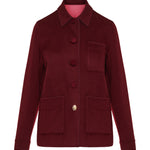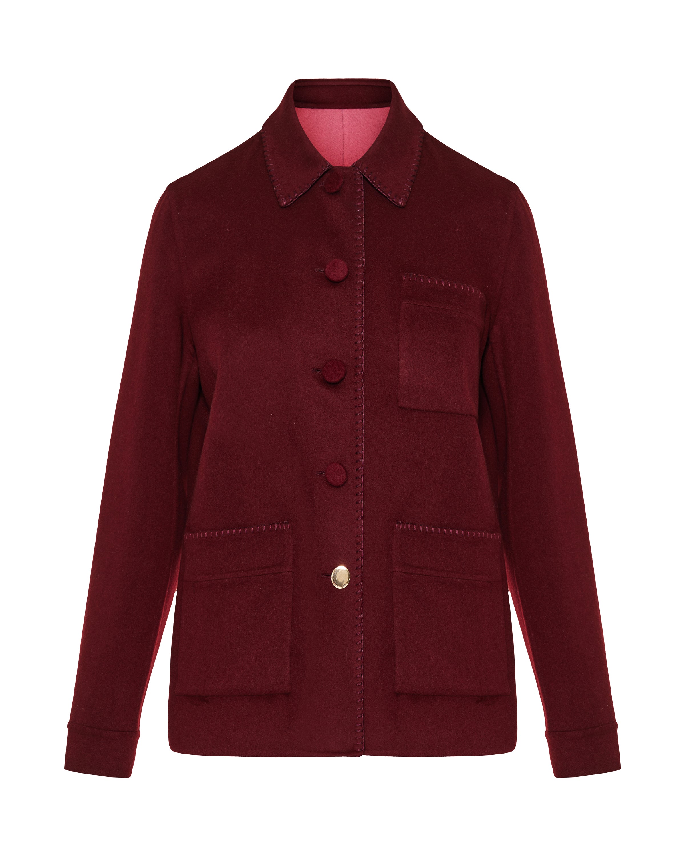 A refined Gabriela Hearst Ulu reversible chore jacket crafted in sumptuous double‑face recycled cashmere with contrasting bordeaux and fuchsia hues and artisanal blanket stitching. Designed for elevated smart‑casual and city wardrobe rotation, it blends heritage utilitarian tailoring with modern sustainable luxury.