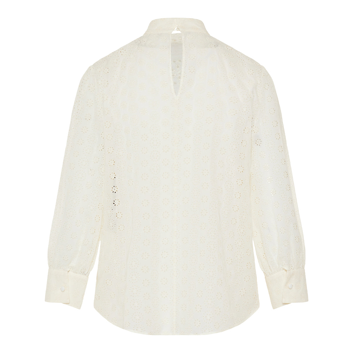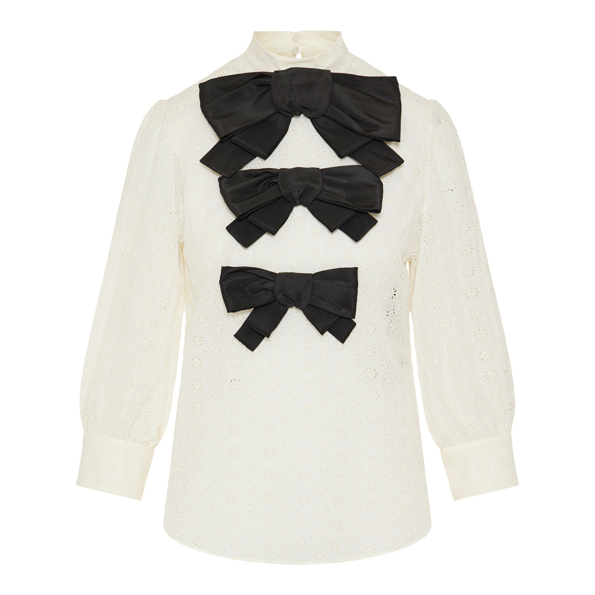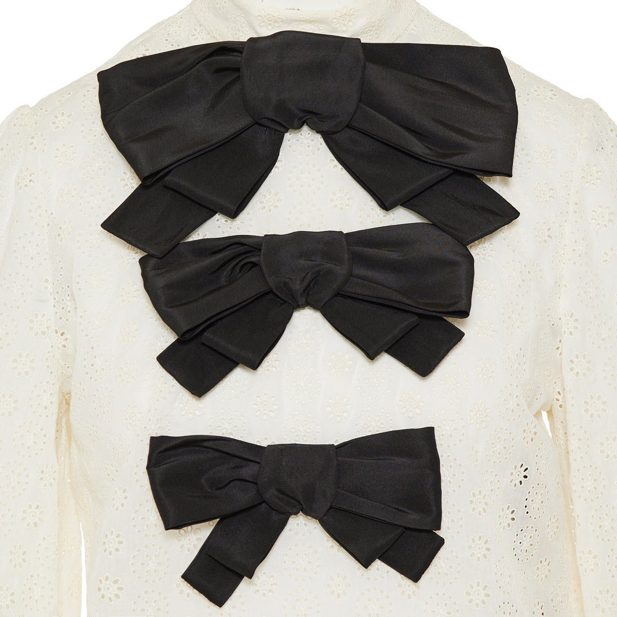 Valentino Garavani’s bow-embellished blouse is crafted in pure cotton with delicate broderie anglaise detailing. Presented in white, it features feminine bow accents and a refined silhouette that reflects the maison’s couture-inspired craftsmanship. A versatile piece that blends romantic detailing with timeless elegance, perfect for elevated daywear or evening sophistication.
