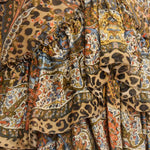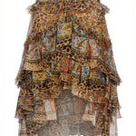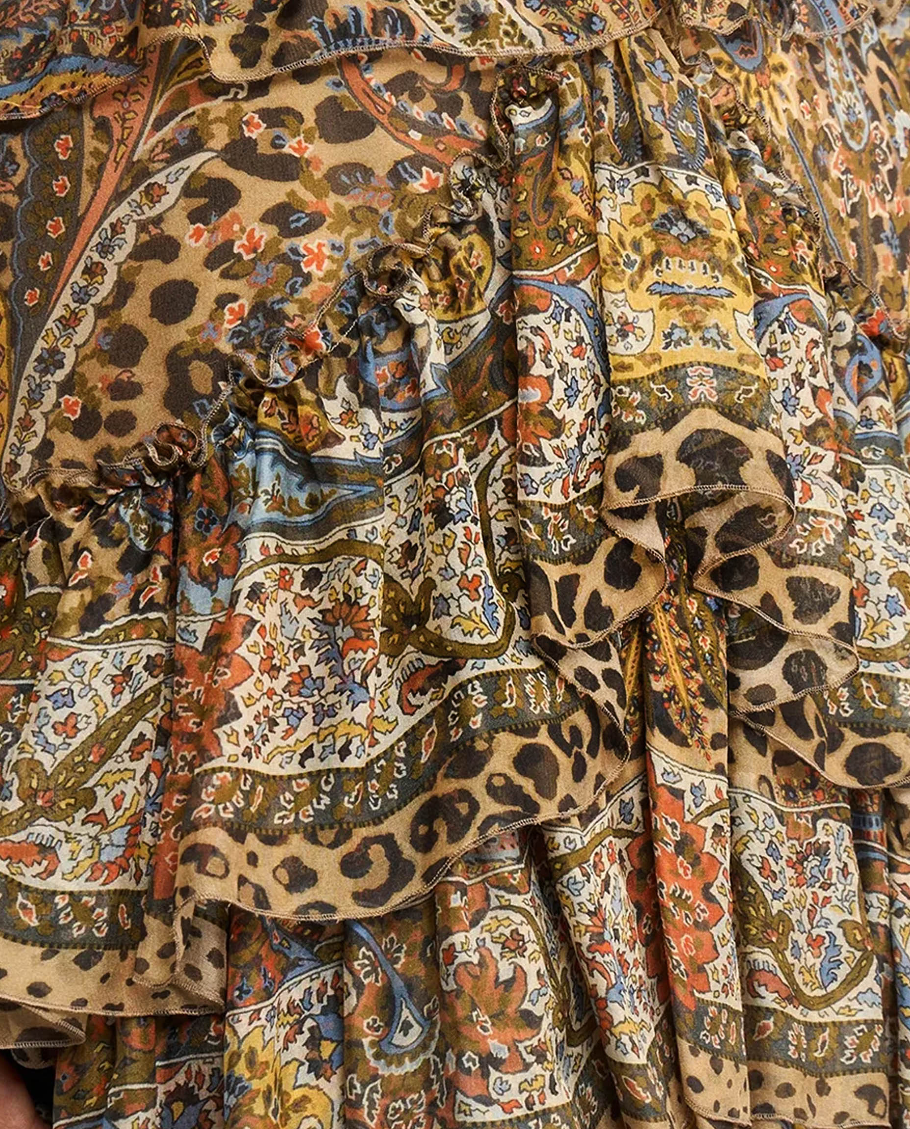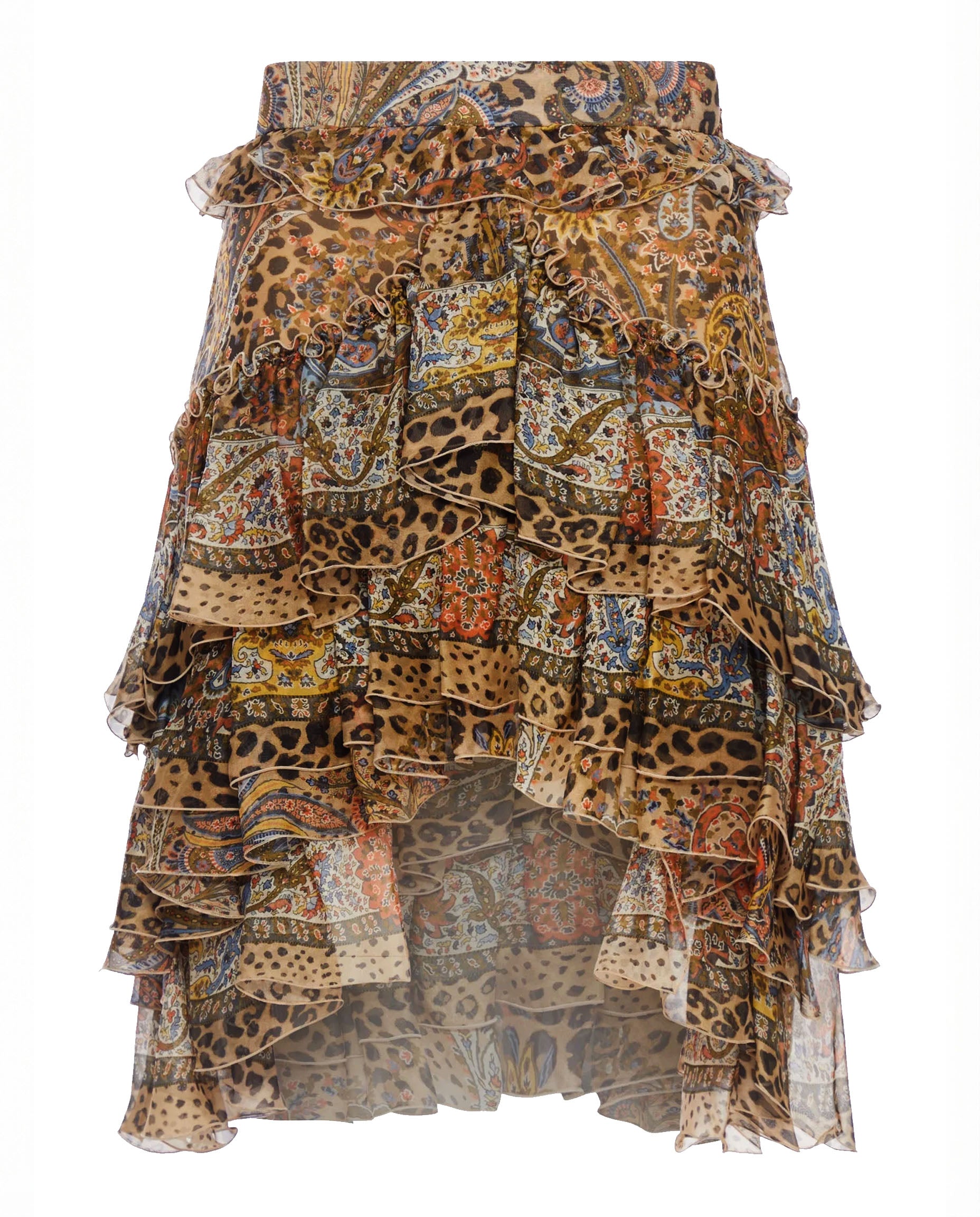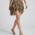A dynamic mini skirt crafted from silk, combining paisley and animal motifs with a softly layered ruffled silhouette.
